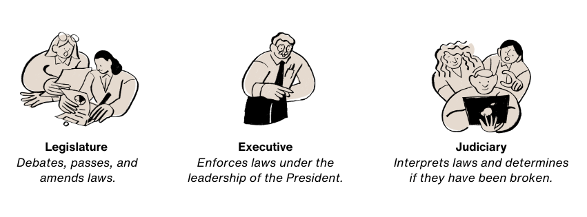 To ensure this balance, democracies split power amongst three branches.2 First, the Legislature (or Parliament) debates, passes, and amends laws. Second, the Executive, under the leadership of the President, enforces laws. Lastly, the Judiciary, through the various courts, interprets laws and determines if they have been broken.3