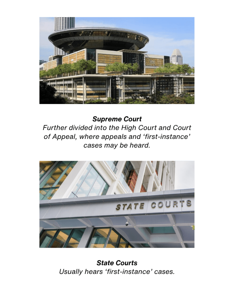 There are two types of courts: the State Courts and the Supreme Court. The Supreme Court is further divided into the High Court and the Court of Appeal. The Court of Appeal hears appeals from the High Court, which in turn, hears appeals from the State Courts. The High Court can also hear ‘first-instance’ cases, which are cases that appear for the first time at the High Court.
