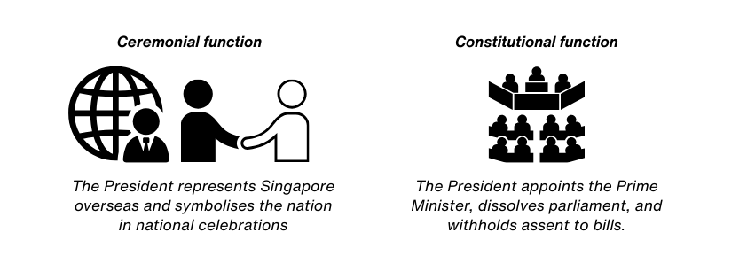 In Singapore, the President is both a symbolic and Constitutional actor. Symbolically, the President represents Singapore overseas as our highest foreign dignitary, and symbolises the nation in national celebrations and receiving foreign dignitaries. Constitutionally, the President has various powers such as appointing the Prime Minister, dissolving Parliament and withholding assent to certain Bills.