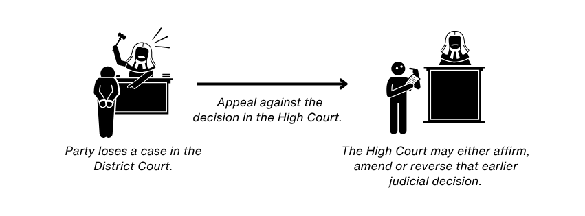Parties to a dispute may be able to challenge decisions of a lower court before a higher court. During such appeals, the decision of the lower court is checked by the higher court for its accuracy. For instance, a party who loses a case in the District Court could appeal against the decision in the High Court. The High Court may either affirm, amend or reverse that earlier judicial decision.